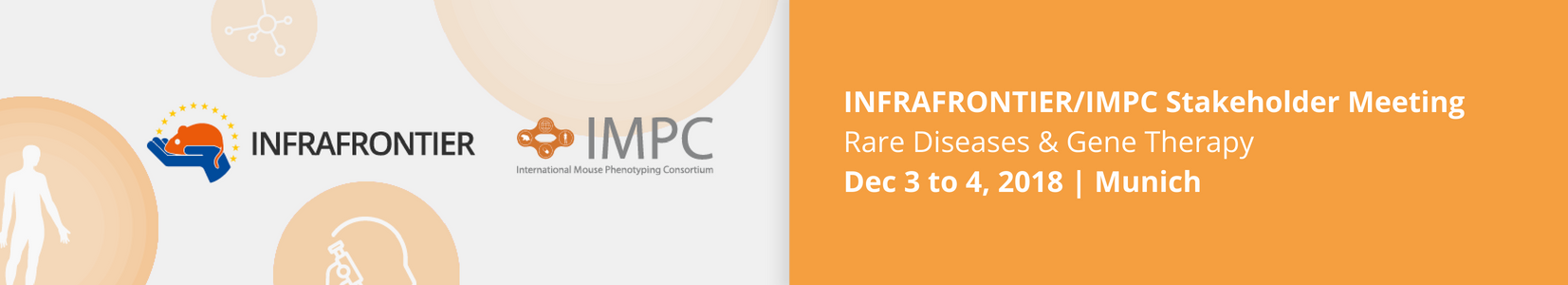 The second Stakeholder Meeting of INFRAFRONTIER, the European Research Infrastructure for phenotyping and archiving of model mammalian genomes, will be jointly organized with the International Mouse Phenotyping Consortium. Thematic focus of the meeting is on advancing Rare Disease research and gene therapy applications with animal models.